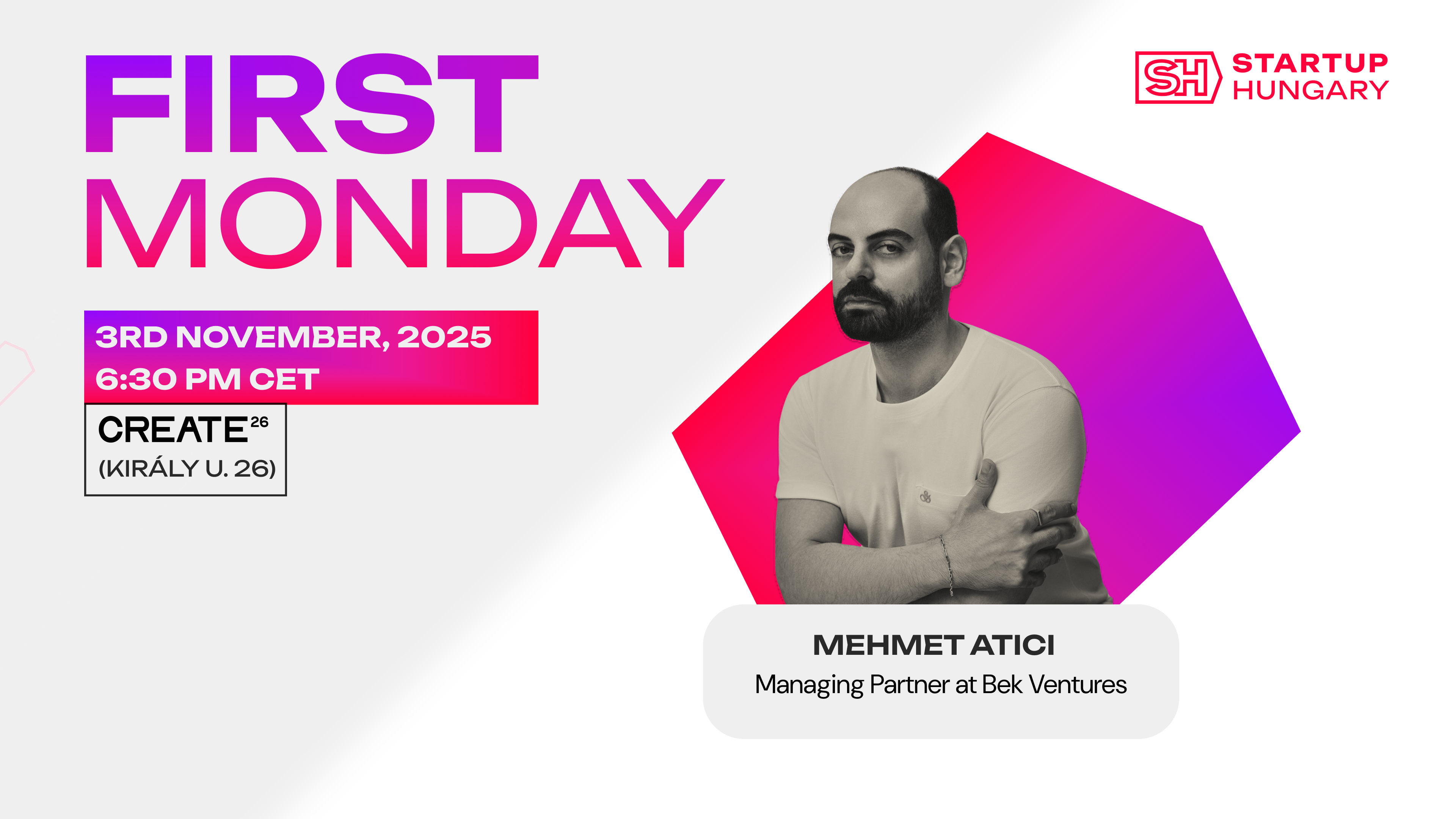 🔥Startup Hungary is excited to host the next First Monday Meetup at CREATE26, featuring Mehmet Atici from Bek Ventures, one of the world’s top-performing venture capital firms.
